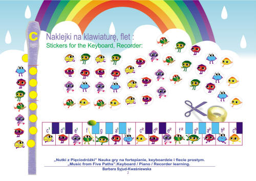 naklejki, kolory i książeczki z zabawnymi nutkami na pięciolinii.